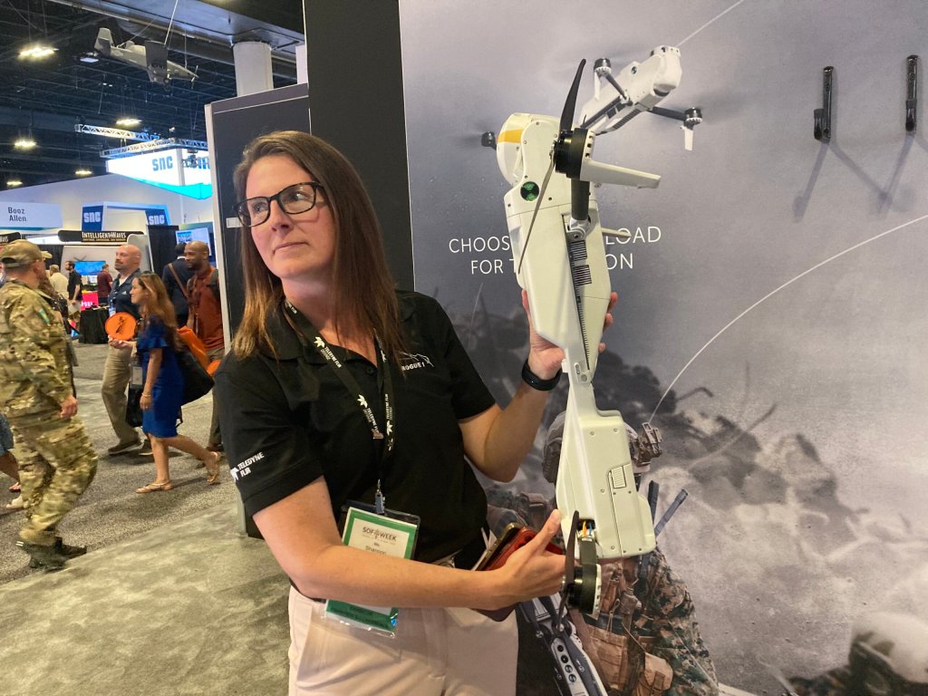Teledyne FLIR Defense senior marketing manager Shannon Jidas holds up a Rogue-1 drone at the 2024 SOF Week special operations conference in Tampa. (Howard Altman/staff ) Teledyne FLIR Defense senior marketing manager Shannon Jidas holds up a Rogue 1 drone at the SOF Week special operations conference in Tampa. (Howard Altman/staff )